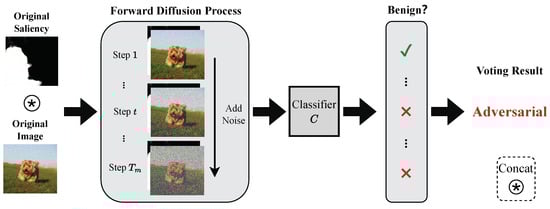 Multistep voting classifier. The multistep voting classifier is actually a process in which the classifier is executed multiple times, as shown in Figure 5. Clearly, is used to classify whether is benign or not. The idea behind this is that may also harm even if its primary aim is to attack f. So, we extend the noise-against-noise strategy into the adversarial detection to alleviate this problem. Inspired by [14], we train to classify noisy images. However, we found that it is difficult to train such a classifier using only RGB image information . This is because the classifier would introduce Gaussian noise at random steps during the training process, which disrupts the adversarial noise , making it difficult to distinguish between benign images x and adversarial examples , causing the training to struggle to converge. To address this issue, we concatenated the output results as additional information using as an input. The detailed algorithm is shown as the function in Algorithm 2. The most crucial step is line 12, where, for different steps t, the input is added with different Gaussian noises , performing operations to disrupt adversarial noise. Then, the classification result is obtained by the classifier at each step t, finally determining the outcome based on majority rule.