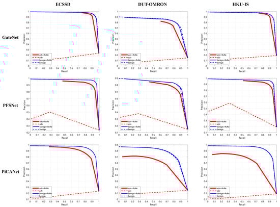 Implementation details. We use one RTX3090 graphic card for computation, and PyTorch 2.0 and Python 3.11 as deep learning frameworks. For the purification module, we select the purification step from DUTS-TR (the training set of DUTS). for GateNet and PFSNet is set to 15, while PiCANet’s is set to 25. For the adversarial detection module, the in the multi-step voting classifier is set to 25 for all the networks. The training data for this classifier consisted of DUTS-TR and the saliency results obtained from each network. We set the batch size to 8, the number of epochs to 10, the learning rate to , and the weight decay to 0.05. The SSIM threshold s is set to 0.8. For the refinement module, we employed the classical UNet architecture. To accommodate the three types of inputs, we expand the encoder threefold and apply separate convolutions. The decoder part remains unchanged. When providing skip connections to the decoder, we concatenate the respective feature maps from the three inputs together. We set the batch size to 20, the number of epochs to 5, the initial learning rate to 0.001 (with a 1/5 reduction every epoch), and the weight decay to 0.