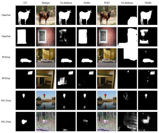 We compare our method, RoRe, with two SOTA methods, ROSA and LeNo, as demonstrated in Table 1 and Table 2. Table 1 illustrates the robustness of various network models defended by our RoRe under PGD attacks. It should be noted that although we use the same attack parameters as LeNo, the accuracy results obtained from the attack slightly vary. This variation can be attributed to two factors: firstly, PGD itself inherently possesses a randomness characteristic; secondly, LeNo only performed PGD attacks on GateNet and used these attacked samples as adversarial examples for PiCANet and PFSNet, resulting in less significant attack effects on the latter two models. However, we launched PGD attacks on all three networks. The “No defense” and “No defense (ours)” in the table corresponding to the accuracy of the undefended network as claimed by LeNo and the accuracy of the undefended network after our attack execution, respectively. In the case of GateNet, RoRe and LeNo have similar effects, with LeNo improving in F-measure by 30% and MAE by 0.24, while RoRe improves in F-measure by 60% and MAE by 0.5. For PFSNet, LeNo enhances its F-measure by 18% and MAE by 0.1, while RoRe increases its F-measure by 40% and decreases MAE by 0.2. On PiCANet, LeNo improves its F-measure by 6% and MAE by 0.01, while RoRe boosts its F-measure by 48% and reduces MAE by 0.1. It can be seen that even when the effectiveness of LeNo’s attacks is generally less than ours, RoRe still manages to elevate the robustness of the models to a higher level.