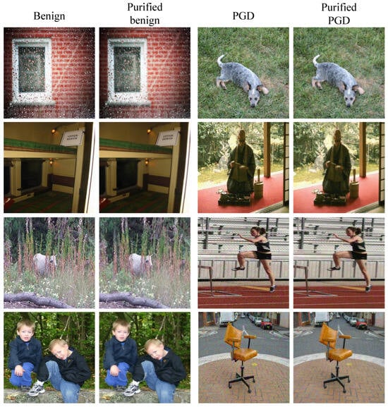 Visualization of the purification results. From left to right, the columns correspond to the benign images, the benign images after purification, the images perturbed by PGD attack, and the perturbed images after purification.