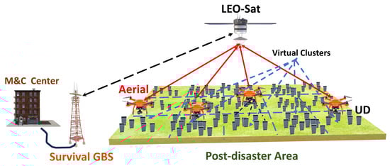 Due to their flying, maneuvering, and hovering merits, aerials have been increasingly used as wireless communication platforms, especially for post-disaster aid services. This is due to their ability to quickly reach remote and hard-to-access areas [1,2,3]. In post-disaster situations, aerials can offer wireless connection for user devices (UDs) owned by survivors and rescue teams where the terrestrial wireless communication networks are completely damaged or malfunctioned [4,5,6,7]. Deploying multiple aerials in such scenarios is challenging, requiring multi-objective optimization, including coverage, limited aerial battery life times, heights, and communication performance. Also, the limited transmission coverage of aerials might hinder their ability to establish communication links with the closest ground base station (GBS) or even among themselves, affecting their arrangement and data collection abilities in post-disaster zones.