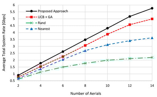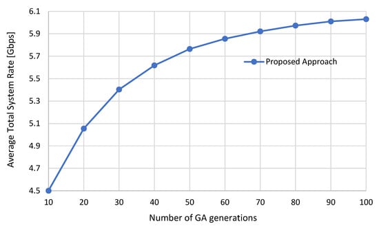 Figure 2 adjusts the number of GA generations, where the average total system rate is evaluated against different numbers of GA generations ranging from 10 to 100. In this simulation, the number of aerials is set to 14 to cover 36 clusters. From this figure, as the number of generations increases from 10 to 50, the average total system rate increases by 28%, while it only increases by 4% when increasing the number of generations from 50 to 100. This means that the average total system rate starts to saturate after 50 number of generations. Considering that the complexity of the GA algorithm increases linearly with an increase in the number of generations, we selected 50 generations to trade off complexity and performance as aforementioned.