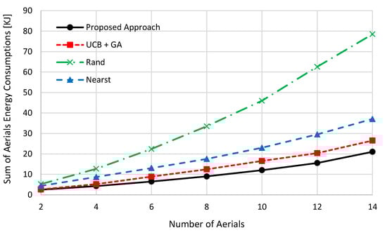 Figure 4 depicts the sum of the aerials’ energy consumption in KJ. As the number of aerials increases, so does the sum of the aerials’ energy consumption for all compared schemes. However, due to the proposed approach’s awareness of the limited aerial battery budget and optimization of aerial TX power, it demonstrates superior performance over other benchmarks regarding aerial energy consumption. The proposed approach has lower aerial energy consumptions than the “UCB+GA” algorithm because it optimizes the flying, hovering, and TX powers of the aerials while UCB only optimizes the aerials’ TX powers using the GA algorithm. Moreover, the “Nearest” algorithm shows a better aerial energy consumption achievement than the “Rand” algorithm as it always chooses the clusters nearest to the aerials, which significantly reduces their flying energy consumption. On the other hand, in the “Rand” approach, clusters are randomly selected, which increases their flying energy consumption relative to the “Nearest” algorithm. This is the reason why the “Rand” algorithm has the worst aerial energy consumption performance. Although both the proposed approach and the “Nearest” algorithm almost select the nearest cluster, the proposed approach has lower energy consumption. This is because the proposed approach optimizes the aerials’ TX communication powers using “GA” algorithms, while the “Nearest” approach uses fixed maximum TX power allocation. When the number of aerials is low, e.g., , the proposed approach has a lower sum of the aerials’ energy consumption than “UCB+GA”, the “Nearest” and “Rand” schemes by 5.2%, 42.7%, and 51.88%, respectively. However, for many aerials, e.g., , these values become 19.23%, 40.7%, and 71.97%, respectively. Compared to the scheme proposed in [23], the improvements over “Rand” and “Nearest” schemes were only 7% and 5%, respectively, at without any improvements at . This superior energy consumption performance of the proposed scheme over that proposed in [23] comes from the aerial TX power optimization mechanism provided by the proposed “GA” algorithm, where the scheme proposed in [23] has no such functionality.