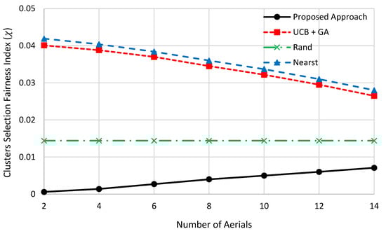 where the term defines how many times cluster i was chosen over the time horizon T divided by the total number of clusters selected. If the clusters were drawn upon their user densities, , reaches zero. This means that as the value of becomes smaller, better fairness is maintained in the clusters’ coverage. From Figure 5, the proposed approach has the lowest values at all tested number of aerials. The clusters’ fairness index of the “UCB-GA” algorithm is higher than that of the proposed approach because it has no fairness functionality. As the clusters are randomly selected in the “Rand” selection approach, the value is almost constant irrespective of the number of aerials used, because the term almost has the same value for , which is almost equal to . On the other hand, both "UCB+GA" and the “Nearest” approaches have the worst fairness performance among the schemes involved in the comparisons because aerials always select their high confidence or nearest clusters, which causes unfairness in cluster coverage. Moreover, as the number of aerials increases, the values of both schemes are decreased, enhancing their fairness performance. This is because many clusters are selected at each time step, which induces better fairness performance over time horizon. As the number of aerials increments, the of all schemes tends to approach that of the “Rand” selection. This is due to the limited number of clusters accessible for choice at every trial, and as the number of aerials is equal to the number of clusters; all schemes will merge to the same point of “Rand” selection. From Figure 4, at , the clusters selection fairness index of the proposed scheme is lower than that corresponding to “UAB+GA”, “Nearest”, and “Rand” selections by 98.5%, 98.57 %, and 95.83%, respectively. However, at , these values become 73.21%,74.64%, and 50.7%, respectively.