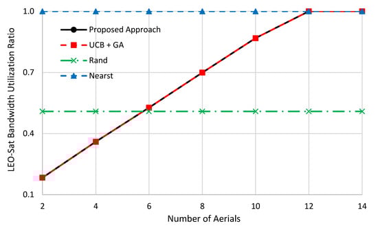 Figure 6 displays the ratio of LEO-Sat bandwidth utilization for various schemes. The “Nearest” algorithm fully utilizes the LEO-Sat bandwidth since it distributes it equally among the LEO–aerial links. As shown in Figure 6, its bandwidth utilization ratio equals 1. On the other hand, the “Rand” scheme’s bandwidth utilization ratio is nearly equal to 0.5 since the bandwidth of each LEO–aerial link is randomly assigned from the range . As the proposed approach and “UCB-GA” algorithms optimize the allocated LEO-Sat bandwidth according to the aerials’ traffic requirements using GA, they have the same performance that comes from utilizing the LEO-Sat bandwidth most efficiently. Initially, they achieve a low Sat bandwidth utilization ratio at fewer aerials. However, full Sat bandwidth utilization occurs as the number of aerials increases. This results from aerials’ high total traffic demands, which operate the LEO-Sat at its maximum capacity. At , they have a lower SAT bandwidth utilization ratio than the “Nearest” and “Rand” approaches by 82%.
