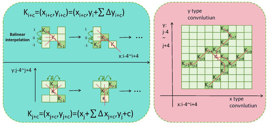 DSConv is an innovative convolution method designed to capture complex geometric features in images with greater accuracy [40]. The fundamental concept behind DSConv is to introduce deformation offsets to provide more flexibility to the convolution kernel in standard 2D convolution operations. While the idea of incorporating deformation offsets was inspired by prior related work, DSConv has made significant key improvements in this domain. In traditional convolution operations, the receptive field remains fixed, which may pose challenges for the model in capturing certain detailed features, particularly those associated with slender tubular structures. DSConv addresses this issue by allowing the model to learn deformation offsets. However, to prevent excessive deviation of the receptive field from the target, DSConv employs an iterative strategy, ensuring that only one target is processed at a time, thus maintaining the continuity of attention [41]. Figure 2 illustrates the network architecture of DSConv. Below, we delve into the mathematical derivation of DSConv.
