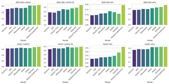 As shown in Table 5 and Figure 5, the performance comparison experiments between YOLOv8-SnakeVision and several other well-known object detection algorithms on two benchmark datasets, BDD100K and NEXET, are presented. The evaluation metrics employed include mAP50 (Mean Average Precision at IoU = 0.5), mAP50-95 (Mean Average Precision across IoU thresholds from 0.5 to 0.95), APs (Average Precision for small objects), and APm (Average Precision for medium-sized objects). First and foremost, YOLOv8-SnakeVision exhibits significant superiority over other algorithms on the BDD100K dataset. It outperforms other algorithms with remarkable scores in mAP50, mAP50-95, APs, and APm, reaching 0.63, 0.44, 0.19, and 0.37, respectively, far exceeding the performance of other algorithms. Furthermore, the same algorithm excels on the NEXET dataset as well. It achieves outstanding scores in mAP50, mAP50-95, APs, and APm, with values of 0.69, 0.50, 0.27, and 0.43, respectively, once again outpacing other algorithms. It is worth noting that YOLOv8-SnakeVision particularly excels in small object detection (APs) and medium-sized object detection (APm), demonstrating its exceptional performance in complex scenarios. This comparison vividly underscores the outstanding performance of YOLOv8-SnakeVision in the field of object detection. In summary, YOLOv8-SnakeVision demonstrates exceptional performance in object detection within traffic scenes, whether it be in the detection of vehicles, pedestrians, traffic signs, or bicycles, establishing a clear advantage. It contributes significantly to achieving safer and more efficient urban transportation.