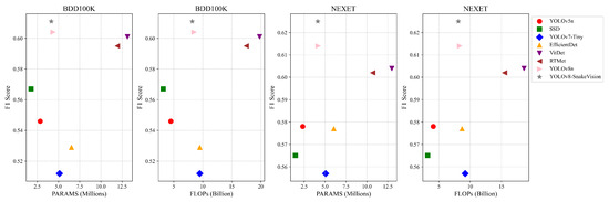 Comparison of Model Parameters (PARAMS) and Floating Point Operations (FLOPs) on BDD100K and NEXET datasets.