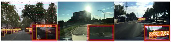 However, our model also exhibits some instances of detection failures, as shown in Figure 8. Firstly, under the conditions of blurred rainy weather, we observed that the model’s detection confidence is relatively low, particularly for small objects, with a confidence level as low as 0.26. This phenomenon may be attributed to the degraded image quality caused by the blurry rainy environment, resulting in unclear edges and details of the target objects. Similarly, in overcast conditions, we also noticed lower detection confidence in our model. This could be due to relatively poor lighting conditions, resulting in reduced image contrast and less distinct features of the target objects. Consequently, the model may face greater visual challenges in accurately detecting targets, necessitating the ability to overcome limitations posed by lighting conditions. Additionally, when images are exposed to intense glare, we observed that the model failed to detect distant cars. This might be attributed to overexposure caused by strong light, making it challenging to distinguish and detect objects in the distant background. In such scenarios, the model may naturally focus its attention on the brighter areas, potentially overlooking distant objects. However, it is essential to note that despite these specific challenges observed in certain scenarios, our model continues to demonstrate outstanding performance in various other scenes and conditions. These instances do not imply that the model is subpar overall but rather highlight that, like any object detection model, it may encounter certain limitations in extreme or complex environments. In the majority of cases, our model maintains its remarkable performance, providing an efficient solution for target detection in various applications.