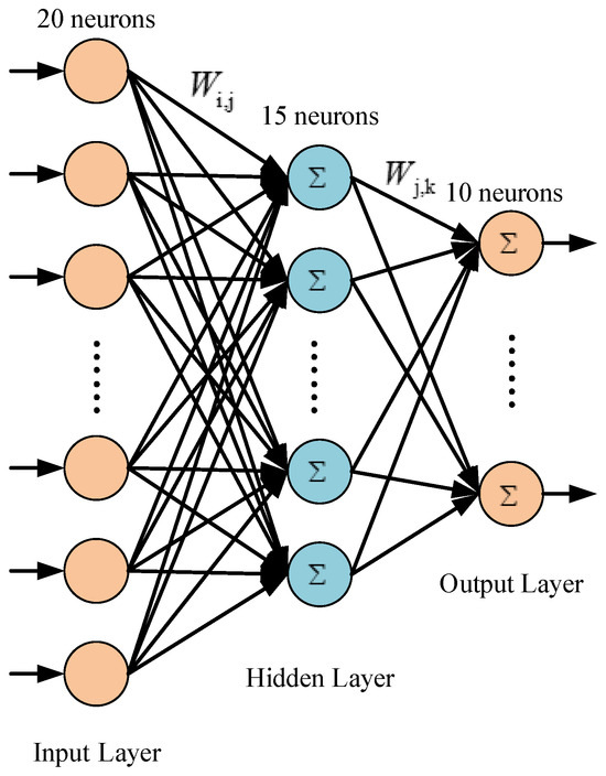 Unfortunately, determining the relationship between flip-flops and logic cells along the circuit path is challenging due to the complexity of circuit structures. A simple fitting equation may not be suitable for all circuit structures. Recently, machine learning has been widely used in integrated circuit design [18,26]. Some machine learning models are used to analyze circuit structures in order to identify inherent connections between circuit cells. In this paper, a machine learning model (BPNN) is used to determine the relationship between flip-flops and logic instances along the circuit path. The BPNN is first described in [27], and its basic structure consists of neurons, interconnection layers, and connection weight values. In this paper, the BPNN model consists of an input interconnection layer, a hidden interconnection layer, and an output interconnection layer. The basic structure is shown in Figure 2. The input layer consists of 20 neurons, which is determined by the maximum number of stages in the data paths. The number of neurons in a hidden layer and the number of hidden layers are adjustable parameters. They can impact the prediction accuracy of the BPNN model. The transient pulse propagation probability calculated by the BPNN model is significantly different from the results of SPICE-level simulations when the number of neurons in one hidden layer is lower (5 to 10). The prediction accuracy is less than 0.6. With an increase in the number of neurons in the hidden layer, the model’s prediction accuracy is significantly improved. When the number of neurons exceeds 15, the calculation accuracy of the BPNN model can approach 0.9. However, the prediction accuracy does not improve any further when the number of neurons exceeds 20. Instead, the training time and prediction time increase significantly. In particular, when the number of neurons in the hidden layer reaches 23, the model’s prediction accuracy is reduced by 2% to 5%. There was overfitting during the training of the BPNN model. Therefore, the hidden layer consists of 15 neurons. This ensures that the calculations are highly accurate and also allows for a more efficient training and prediction time. Furthermore, the model’s prediction accuracy does not significantly improve as the number of hidden layers increases. However, including additional connection weight values required significant adjustments, which led to a substantial increase in training time. Therefore, there is only a single hidden layer used to construct the BPNN model. The output layer consists of 10 neurons, which is determined by the range of propagation probability. The input vectors of the BPNN are the probabilities of transient pulse propagation along the circuit path. The output value of the BPNN is the probability that a transient pulse can propagate to a flip-flop. The basic neuron is activated by the sigmoid function: