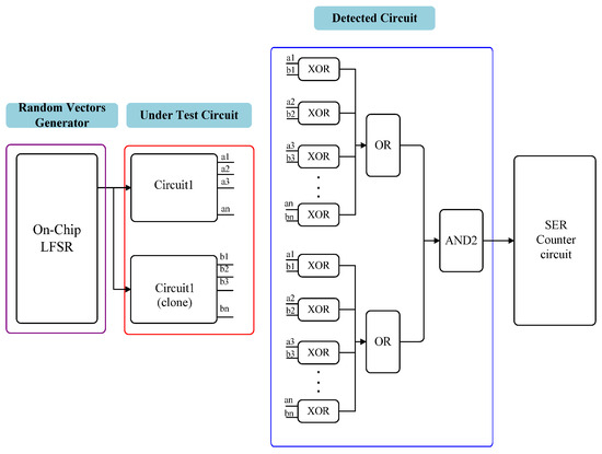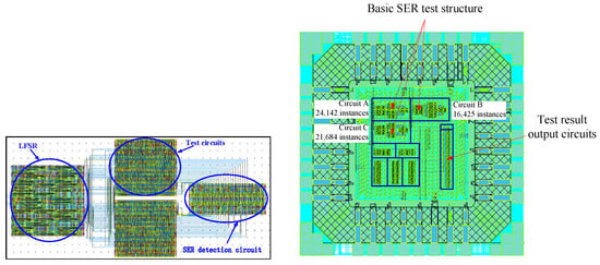 A SER test structure was designed using commercial CMOS technology to investigate the accuracy of the proposed approach. The schematic of the SER test structure is shown in Figure 5. It consists of one random vector generator, two test circuits, and one SER detection circuit. The random vector generator (Linear Feedback Shift Register, LFSR) is used to create the input vectors. The test circuit consists of combinational logic instances and flip-flops. Note that two test circuits have the same topology and layout structures. However, they are spaced out widely to ensure that an incident particle only impacts one test circuit, as shown in Figure 6. The input pins of two test circuits are connected to the random vector generator. It ensures the test circuits have the same input vectors. The SER detection circuit consists of several XOR-gate instances and OR-gate instances. The XOR-gate instances compares the output values of two test circuits. If a test circuit is irradiated by incident particles, the output values are changed. However, the other test circuit is not impacted by incident particles; it can produce correct output values. The XOR-gate instance produces a 1 due to the different output values. The soft error induced by the incident particle is propagated to the SER counter circuit and satisfied.
