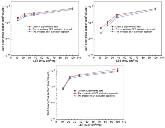 The proposed evaluation approach and the SPICE-level evaluation approach were used to investigate the SER of test circuits. The gate-level netlist of three test circuits serves as an input file for the evaluation approaches. The number of transient pulse injections per test circuit is determined by dividing the particle flux by the layout area of the test circuit. The position and moment of transient pulse injection are random. This is due to the fact the location and momentum of the incident particles are random during radiation experiments. The width of transient pulses injected into the test circuit is set to 100 ps, 200 ps, 350 ps, and 500 ps, respectively. It represents the various pulse widths generated by different particles. These data were determined through our previous transient pulse measurements [31,32,33]. For each test circuit, the number of soft errors can be obtained when the evaluation tool completes the transient pulse width injection simulation. According to the number of soft errors, the soft error cross-section can be calculated using the following equation:
