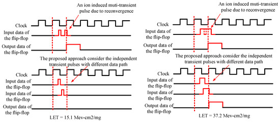Figure 7 shows the comparison between the evaluation results and experimental results. The evaluation results obtained by the proposed approach show good consistency in both trend and order of magnitude. The difference between the results obtained using the proposed approach and the experimental results is calculated. The average value is 23.5%, which is 7.5% higher than that between the conventional evaluation approach and the experimental results. When the LET value is 15.2 MeV·cm/mg, there is a greater discrepancy between the simulation results and the experimental results. With the increase in LET value, the simulation results are in good agreement with the experimental results. Some reasons may cause this difference. The first reason is that the proposed approach does not consider the transient pulse reshaping and reconvergence. Transient pulse reshaping or reconvergence results in a change in the width of the transient pulse, which in turn change the data value of T in Equation (11). Circuit-level simulations are used to investigate the difference in circuit A at low LET values. When particles strike most instances, it only generates a transient pulse that propagates to the input of the flip-flop. However, when a particle strikes a specific instance with a large fanout, although it only produces one transient pulse, more than one transient pulse is propagated to the input of the flip-flop due to pulse reconvergence, as shown in Figure 8. For the proposed approach, it is still evaluated based on the pulses that propagate independently on different data paths. As a result, the evaluation results may not accurately reflect soft errors and may differ from the experimental results. When the LET value increases, the transient pulse width generated by the ions also increases. It reduces the change in the width and number of transient pulses caused by the pulse reconvergence. The evaluation results obtained using the proposed evaluation method are closer to the experimental results.