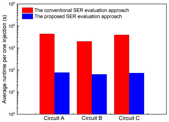 Figure 9 shows the average simulation runtime of the proposed approach and the conventional SER evaluation approach. For the conventional evaluation approach, the circuit-level simulation tool is used to simulate the propagation of transient pulses. This simulation helps determine if the flip-flops can capture the transient pulses. Although the size of the test circuit is only 10,000 instances, it results in a significant increase in time cost for a single circuit-level simulation. The significant time cost greatly reduces the evaluation performance of the conventional evaluation approach. For the proposed approach, a machine learning model (Equations (4)–(6)) is utilized to calculate the probability of transient pulse propagation. Subsequently, the transient pulse is captured using the transient pulse probability equation (Equation (11)). The proposed method can determine the soft error of the circuit solely through equation calculations. Therefore, the proposed method can significantly reduce the time required and enhance the performance of soft error evaluation.
