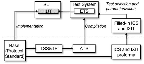 Conformance testing enables the identification of both expected and anomalous behaviors within specific protocols. However, this form of testing does not encompass the entire system; rather, it focuses on verifying system compliance with particular scopes or requirements as delineated in the testing specifications. Moreover, conformance testing does not evaluate the system’s interoperability with other systems. Specifications for conformance testing in the realms of Global System for Mobile Communications (GSM), Universal Mobile Telecommunications System (UMTS), and Voice over Internet Protocol (VoIP) have been formulated by the European Telecommunications Standards Institute (ETSI). These test specifications are crafted in accordance with the ISO/IEC 9646 conformance testing methodology, which is well established and documented []. References to critical elements of the ISO/IEC are made within these conformance testing specifications, and the widely adopted procedures are illustrated in Figure 1. The following items elucidate the framework and components integral to conformance testing, as well as the role of TTCN-3 in facilitating these assessments: