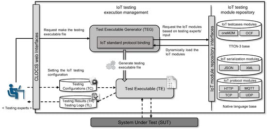As shown in Figure 3, CLOCIS is compartmentalized into two principal logical structures: IoT testing module repository and IoT testing execution management. Conformance testing is executed through systematic interactions between components within these structures. Moreover, CLOCIS features web interfaces that facilitate remote IoT conformance testing, allowing testing professionals to conduct and review tests from afar. Below, we delineate the logical structures of CLOCIS and the components within each.