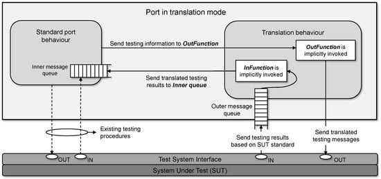 As shown in Figure 4, the “Port with Translation Capability”, an augmented TTCN-3 construct, enables the conversion of one message form to another during the process of sending or receiving messages. Despite the definition of testing behavior upon a single structured data type set, it is applicable in scenarios wherein the actual communication involves disparate structured data types, for instance, in cases where the SUT operates on a different layer of the protocol stack compared to the testing system. Concretely, oneM2M standard (service layer) primitives can be transmitted to HTTP-based (application layer) oneM2M IoT platforms or devices following the oneM2M HTTP protocol binding encoding scheme [].
