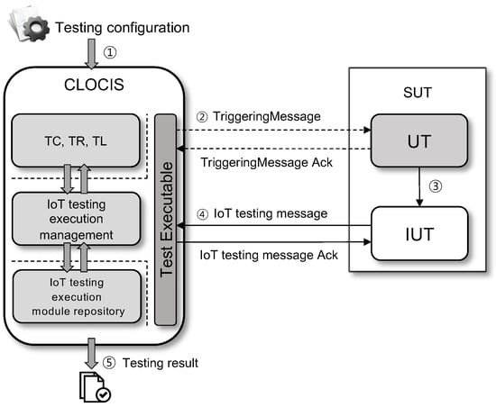 Employing the aforementioned functionalities facilitates automated conformance testing for IoT devices, which proceeds as follows (see Figure 5): (1) The testing expert inputs the test specifics into the test generator (TG) of CLOCIS and initiates a test case for a designated device. (2) The testing system dispatches a TM, which contains pertinent testing details, such as the test case name, serialization data, protocol type, and the testing system’s address and port information. If the test cases relate to the POST or PUT methods, the TM also includes data detailing the content to be sent in the body format. (3) Upon receiving the TM, the UT analyzes the content, determines the required testing actions, and executes the appropriate function on the Implementation Under Test (IUT), subsequently conveying the results back to the testing system. (4) Ultimately, the device’s response to the function under verification allows the testing system to render a verdict—such as pass or fail—and thereby evaluate the device’s compliance with the standard.
