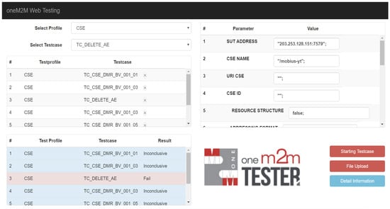 The Testing Result (TR) and Testing Log (TL) components store the outcomes and logs of conformance tests. Test case verdicts are categorized as follows: “Pass” when the SUT behaves as expected, “Fail” when it does not, “Inconclusive” when a definitive result cannot be ascertained, and “Error” when there are faults within the testing system []. The logs capture message exchanges between the testing system and the SUT, providing testers with insight into the compliance of IoT platforms or devices with standards. Should the results be unsatisfactory, testers can consult the logs to pinpoint and rectify the issues.