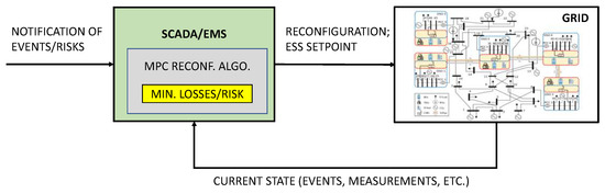 The remainder of the paper is organized as follows. The next section presents the reference scenario of the study, and the MPC control logic. Section 3 presents the formulation of the proposed MPC reconfiguration algorithm, detailing the problem constraints and the objective function. Section 4 presents the simulations performed to validate the approach, considering a grid equipped with ESS and renewable plants. Finally, Section 5 reports the conclusions and the proposed future works.