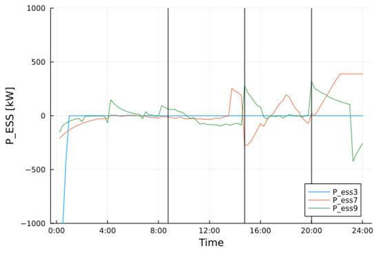 The behaviors of the power and energy stored by ESSs are shown in Figure 8 and Figure 9, respectively. ESSs at buses 7 and 9 are always an active part of the network. First of all, they are located in a sensible part of the network. ESS 7 has to feed the tree of the network, which is disconnected from any DG, it has to feed a large tree, and it is also located away from the primary substation. After 12:00 and 18:00, its role is to power the largest tree in the network. ESS 3 is never activated, as expected, because it is directly connected to the HV/MV substation.