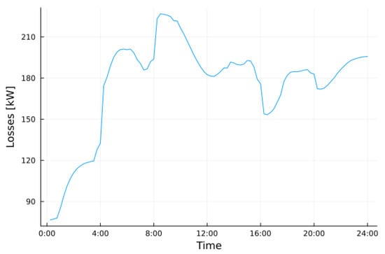 The last consideration regards the power losses, and the simulations of Section 4.2 and Section 4.3 are compared with the case in which the network is static, i.e., no reconfiguration occurs. To this end, the reference scenario is the one depicted in Figure 2, in which links with solid lines are considered fixed links and the ones with dotted lines are always considered open (). Losses are simply calculated as the sum of the power injections at each bus. Figure 15 and Figure 16 show losses in the static scenario, and the total mean loss is 4.9%.