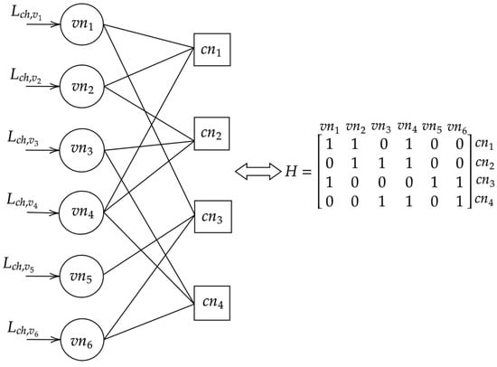 Low-density parity check codes (LDPCs) [] have become one of the essential channel codes in many communication standards, such as DVB-S2 [], IEEE 802.11 (WiFi) [], IEEE 802.16e (WiMax) [], and including fifth-generation (5G) wireless technology [], because of their higher error correction capabilities, which are close to Shannon’s limit [,]. In 5G New Radio (NR) specifications, quasi-cyclic (QC) LDPC codes are selected as the channel coding scheme for data channels to achieve high throughput and low latency []. These QC LDPC codes have adopted two base graph matrices (BGMs): and , and fifty-one lifting sizes or expansion factors to support various code rates []. has the dimension of 46 block rows and 68 block columns, and it supports code rates ranging from 1/3 to 8/9. has a dimension of 42 block rows and 52 block columns and supports code rates from 1/5 to 2/3. The PCM H is represented and constructed from its BGM []. A binary LDPC code in 5G is characterized by the null space of parity check matrix (PCM) H with dimension over GF(2). The PCM is also visualized graphically as a bipartite Tanner graph [,]. A set of M parity or check nodes of the Tanner graph represent the rows of H, and a set of N bit or variable nodes of the Tanner graph represent the columns of H. The decoding of LDPC codes is done iteratively using the message-passing algorithm on its bipartite Tanner graph []. For an example (6, 2) LDPC code, parity check matrix (PCM) H and its Tanner graph are shown in Figure 1. A Tanner graph comprises two types of nodes, one is bit or variable nodes (VNs) , , , , , and the other is parity or check nodes (CNs) , , , . These nodes are connected by bidirectional edges based on the number of ones in the PCM of the code.