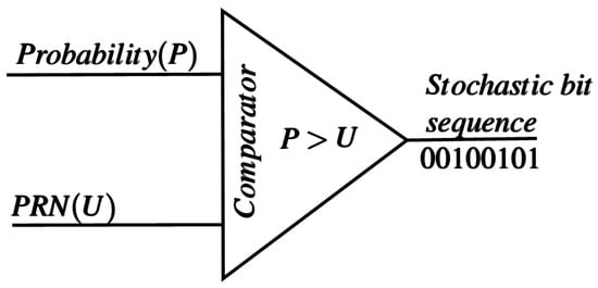 The term is an exponential function. The value is represented with W binary symbols and compared with W-bit pseudo-random number (PRN) of the comparator [], which varies with every clock cycle to generate an equivalent stochastic bit sequence of length , as shown in Figure 2. For example, is represented as -bit fractional binary symbols . At each clock cycle, a PRN generator based on a linear feedback shift register (LFSR) [] produces a new -bit PRN U. Suppose : the comparator output at that clock cycle is 1 and otherwise is 0. As shown in Table 1, after eight clock cycles, the comparator output is 00100101, which is the stochastic bit sequence belonging to . This sequence has a mean value of , which is close to [].