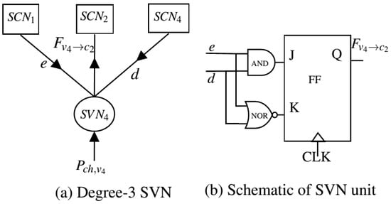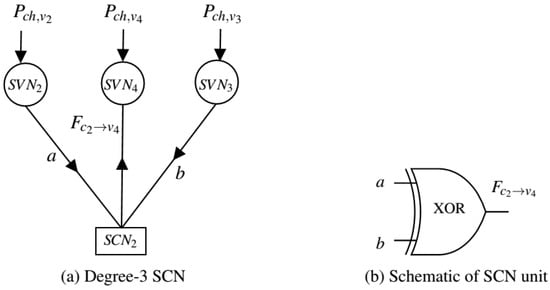 (3) SVN update: In Figure 4, is connected to three SCNs: , , and . The arriving SVN-to-SCN single-bit extrinsic message for node is computed as