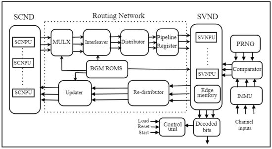 The suggested FPGA-based partially parallel stochastic decoder’s top-level design is presented in this section. It has runtime flexibility and the capability of decoding received messages corresponding to the set of seven code rates 1/3, 2/5, 1/2, 2/3, 3/4, 5/6, and 8/9 and codeword length N = 3808 for QC LDPC code compliant to the 5G NR standard. Initially, the architecture determines the maximum matrix dimensions, such as the number of block columns , the number of block rows , lifting size , column-weight , and row-weight , for this decoder from the supported code rate set. The architecture comprises various basic modules such as a stochastic variable node decoder (SVND), a stochastic check node decoder (SCND), BGM read-only memory (ROM), a controller unit, an intrinsic message memory unit (IMMU), and a routing network between modules SVND and SCND. These modules of the design are explained in the following subsections.