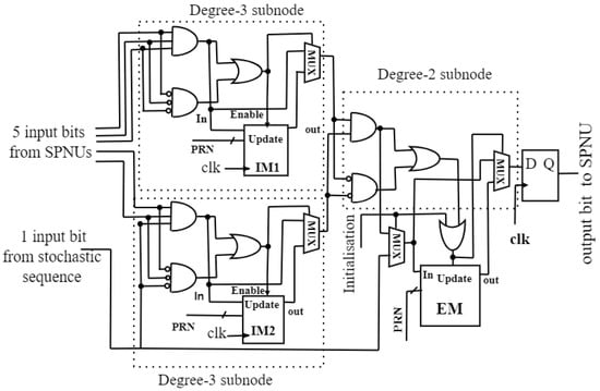 As shown in Figure 6 [], the column-weight SVNPU is constructed using two column-weight and one sub-nodes. The memory blocks are internal memory (IM), which has a length of bits for each sub-node, and edge memory (EM), which has a length of bits at the output edge. The critical role of EM and IM is to minimize the correlation produced by the hold state in a stochastic sequence and disrupt the correlation of the stochastic sequence by randomizing stochastic bits []. We used a dual-tree design [] to build a high-column-weight SVNPU that would be flexible enough to handle any active inputs and outputs up to the maximum , which is a power of two. For instance, column weight of SVNPU has inputs and outputs. As a result, the adopted SVNPU dual-tree design requires a total of sub-nodes. Two significant components, summing and combining, each with stages, make up the dual-tree structure.