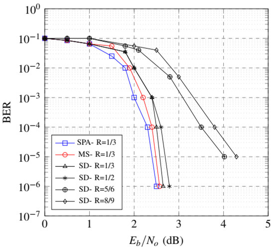Figure 8 shows BER performance of the proposed decoder, which delivers BER = at 2.65 dB of for a block length of 3808 with a base code rate of 1/3. It has been observed that SD provides better error correction performance compared with the conventional sum–product (SPA) and min–sum (MS) algorithms. Notably, decoding iterations of SD require more clock cycles than conventional designs. Additionally, it has been observed that applying noise-dependent scaling of 0.86 [] to the received channel probabilities improves performance for lower code rates such as 1/3 and 2/5. Conversely, this performance declines for higher code rates such as 5/6 and 8/9.