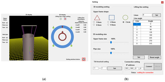 The setting window can be accessed by clicking a button at the bottom right of the main screen. As shown in Figure 3, it consists of a 3D modeling setting window, a tilt threshold setting window, a lifting line setting window, and a connection setting window. The 3D modeling setting window enables the selection of the shape of the upper frame and the number of lifting lines based on the construction type; it also enables the adjustment of the size of the 3D model of the steel pipe. The tilt threshold setting window can set the limit of the allowable tilt range of the steel pipe depending on the purpose of construction. The number of lifting lines and angles can be set in the lifting line setting window. The user can connect to the embedded board with the system software to measure the verticality information by inputting the IP address in the connection setting window. The verticality information is displayed in the display program upon a successful connection.