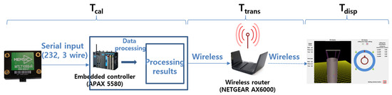 To effectively apply the proposed monitoring system to a real foundation construction environment, the system should display the verticality information in real time. In this section, we estimate the time delay for each part to verify that the verticality monitoring system satisfies real-time requirements. The data display latency of our monitoring system comprises data calculation, data transfer, and data display latencies (Figure 4). The total time delay for data display is given by Equation (1), the latency for calculating verticality data is given by Equation (2), the latency for transferring data to the display program is given by Equation (3), and the latency for display on the monitor device is given by Equation (4).