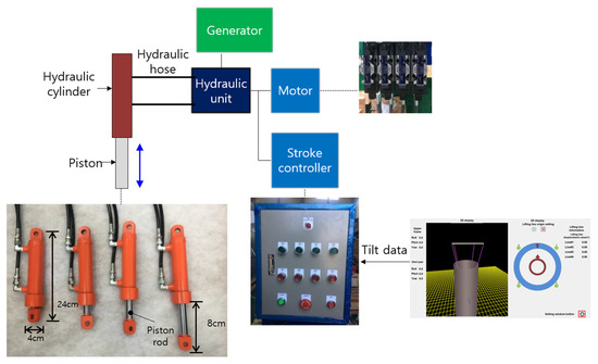 The automatic lifting cable control system used to individually adjust the cable length consists of a hydraulic actuator, a hydraulic pump system for operating the hydraulic actuator, a relay circuit to turn the actuator switch on and off, a controller to control the relay circuit, and a serial communication circuit to receive data from the monitoring system (Figure 5). Three factors were considered when implementing an automatic lifting cable control system using an actuator. First, it should be easy to connect the actuator to a lifting cable. Second, it should be possible to control actuators mounted on multiple lifting cables connected to a circular steel pipe. Third, automatic verticality control should be possible.