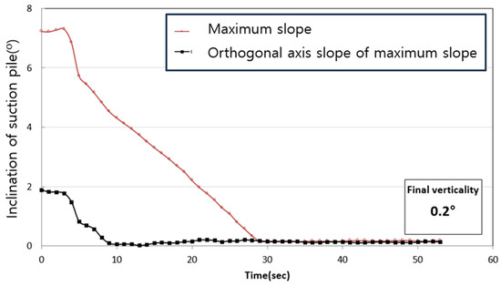 Securing the verticality of a foundation is extremely important for safety because the superstructure built on the foundation is extremely heavy, and a tilt in the foundation can affect its stability and performance. However, bucket inclination can occur owing to the inhomogeneity of the subsea ground. For pile foundations, the verticality standard for offshore construction is 1/25 of the pile length in Hong Kong and 1/50 in Canada [11,12,13]. Contrarily, there is no verticality standard for the suction bucket foundation; hence, they are usually constructed within the allowable verticality in the specification or design of the structure.