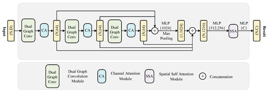 where represents the activation function, represents the batch normalization, and represents the edge features of the dual graph structure. Subsequently, the local feature extraction of point clouds is realized via feature aggregation operation, as shown in Equation (4):