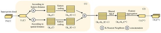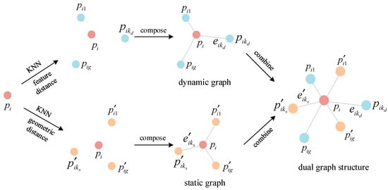 The input point clouds are defined as , is the number of point clouds, represents the i-th point of the input, represents the 3D coordinate vector of point , represents the feature vector of point , and is the feature dimension. For an input point , the construction process of the dual graph structure is shown in Figure 3. The red circle indicates the center point, the blue circle indicates the nearest neighbor point searched by the feature distance, and the orange circle indicates the nearest neighbor point searched by the geometric distance. Firstly, is regarded as the center point, and the feature distance between the center point and the remaining points is calculated by the K-nearest neighbor algorithm. The nearest points are selected as the nearest neighbor points, ( = 1, 2…,), and the edge features between the nearest neighbor points and the center point are calculated, as shown in Equation (1):