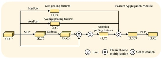 where represents the set of edges of the dual graph structure, represents edge features of the dual graph structure after feature extraction, represents the local feature of point , and represents the feature aggregation operation. For feature aggregation, the common approach is to use max or average pooling to extract the maximum or average value of local neighborhood features as a representation. However, simple pooling operations can result in a significant loss of information from the neighborhood. To ensure that local neighborhood information is transmitted as much as possible, we propose a feature aggregation module that combines attention mechanisms with both average and max pooling methods. This allows for automatic focus on important local neighborhood information while considering all features within the area. The feature aggregation module is shown in Figure 4, which corresponds to the feature aggregation process in Figure 2.