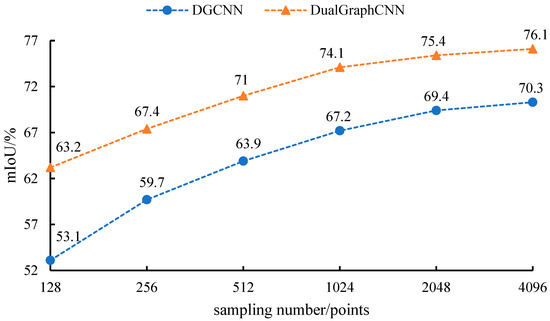To evaluate the model’s robustness to sparse point clouds, we trained it on regions 1–5 of the S3DIS dataset using randomly subsampled point clouds with 2048, 1024, 512, 256, and 128 points in addition to the original sampling of 4096 points. We then tested the Mean Intersection over Union (mIoU) of our model on region 6 and compared it with that of DGCNN. As shown in Figure 8, our proposed model achieved higher mIoU at different sampling points than DGCNN did; this gap widened as the number of sampling points decreased. When only using a sample size of 128 points, our model outperformed DGCNN by a margin of up to 10.1%, indicating its superior robustness to sparse point clouds.