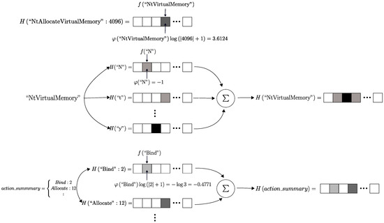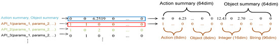 Likewise, the API itself contains some information. This is because the developers of the operating system define the API in a principle to a specific naming convention, usually semantic-based naming [27]. For example, NtWriteFile contains both write as an action. Thus, the API name contains some semantic information that reflects the behavior of the API and the object it operates on. Based on this principle, we think it is meaningful to semantically segment an API name, to separate API into actions and objects, rather than just simply handle the whole API or split it by words, which is exactly what is conducted in [9]. Therefore, when we combine the API and parameter information together, we can obtain the complete semantic information. Inspired by the work in [9], we use the hash method proposed in [28] to encode the action, object, and parameter of the API separately. The whole process of generating feature vector is shown in Figure 2.