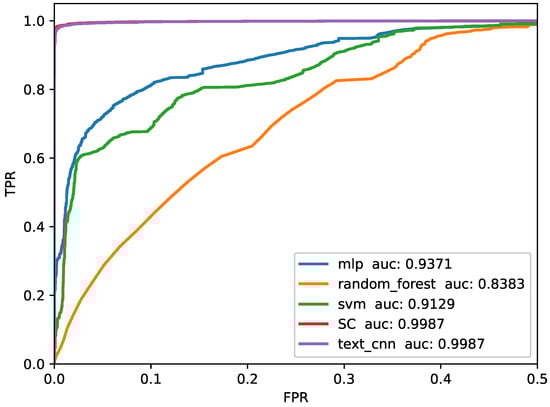 In this paper, machine learning algorithms such as SVM and MLP are used as baseline models. The feature vectors obtained after semantic chain transformation of API sequences are put into the baseline model for feature mining and examining the indicators such as accuracy to evaluate the model performance in this paper. In addition, a widely used sequence processing method, embedding + TextCNN, is selected as the baseline for comparison in this paper. The results of the experiments can be observed in Table 4; the ROC curve is shown in Figure 6. Obviously, the method proposed in this paper outperforms all the baseline models.