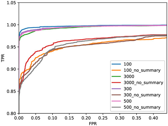 To verify whether the supplementary information used in the method has a positive effect on the truncated sequences, an additional set of experiments is set up in this paper. In this set of experiments, different lengths are truncated from the API sequences. Considering that the maximum length that the pre-trained model BERT can handle is 512, three different lengths of 100, 300, and 500 are set in this paper. In addition, an experimental group with sequence length of 3000, which cannot be handled by the general model, is also set in this paper. For each sequence length, two experiments are conducted in this paper, i.e., with and without the addition of supplementary information. The final F1-score is shown in Table 6, and the ROC curve is shown in Figure 7. As is shown in Table 6, the F1-score obtained by sequences with summary is significantly better than those without summary, which means summary information is indeed useful for complementing the truncated chain information. Furthermore, with an increase in the length of sequences, the results that belong to sequences without summary maintain a trend of decreasing, which means that the detection performance would reduce with longer sequences without complementary information. On the other hand, the results conducted by sequences with summary showed a curved trend. Initially, a decrease occurs as the sequence length increases, but an increase begins after reaching a certain length. The reason, according to our analysis, can be that it is more easy for a deep learning network to fit when the sequence length is short, and, when the length is not so short, the model’s degree of fit will decrease for a while. After that, as the sequence length is further increased, the summary information will play a more prominent role.