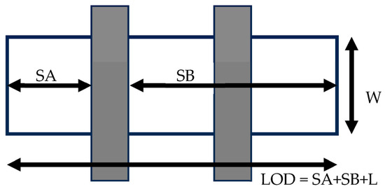 Figure 3 presents a typical MOSFET layout. The layout parameters of interest are listed in the figure. W and L represent the gate’s width and length, respectively; SA and SB are lengths between each gate and the STI edge; and LOD is the length of the active area.