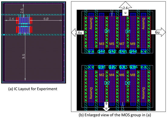 As shown in Figure 2, four MOS transistor layouts of different sizes—labeled M0, M1, M2, and M3—were generated from a foundry standard PDK library to investigate DFM. The spacing between the well edge and the oxide edge of M0, M1, M2, and M3 is 2.6, 5, 10, and 20 μm, respectively. Once LVS (layout versus schematic) had been completed, Siemens EDA Caliber XRC software was used to perform layout parasitic extraction (LPE) flow with the 28-nm LPE command file provided by the foundry. Table 1 shows the LPE results. The extracted SCA, SCB, and SCC values of M0 are much larger than those of M1, M2, and M3, indicating that the WPE is greater on a MOS transistor with a smaller spacing between the well edge and the device oxide edge. The SCA, SCB, and SCC values of M1 are smaller than those of M0 but larger than those of M2 and M3, indicating that the WPE becomes weaker as the spacing between the well edge and the device oxide edge is increased, but the WPE can be neglected when the spacing between the well edge and the device oxide edge is larger than 10 μm. As revealed by the extracted parameters presented in Table 1 and obtained from Equations (1)–(4), a smaller spacing between the well edge and the device oxide edge is associated with larger values of SCA, SCB, SCC, and VTH.