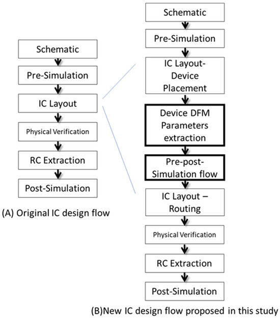 Figure 5A illustrates the conventional process of Fully Custom IC design [6,7]. After the circuit schematic is completed, simulation follows, usually referred to as the presimulation stage. Upon completion of presimulation, it proceeds to the IC layout stage, followed by physical verification, including validation processes like DRC, LVS, and ERC. Post physical verification, RC parasitic parameters are extracted. In addition to parasitic RC caused by metals, RC-Extraction tools are capable of extracting the parasitic parameters of components, including MOS channel width and length, source/drain perimeter and area. Additionally, they include DFM parameters, such as SCA, SCB, SCC affecting WPE, as well as SA, SB affecting LDE, and others.