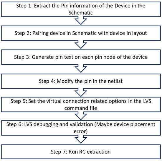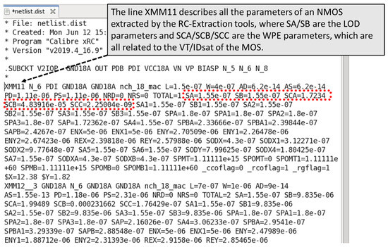 As shown in Figure 5B, a self-developed algorithm is used for the electronic design automation tool to confirm that the IC layout corresponds to the original IC design schematic. Next, the LPE phase is initiated to extract the DFM parameters of each component (excluding parasitic RC generated by routing). The resulting Simulation Program with IC Emphasis (SPICE) netlist must be confirmed to fully describe the connection relationships that ensure the integrity of the entire circuit, thereby enabling the subsequent simulation; this confirmation is called the pre-postsimulation.