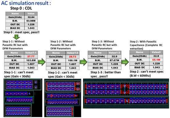In Figure 12 Problem convergence process for the AC simulation results of the case study, the results revealed that because of device placement and various masks (e.g., N-well, oxide diffusion, polysilicon, N-implant, and P-implant) in the three IC layout floor plans generated between Steps 1–1 and Step 1–3, the LDEs became observable in Step 1. Therefore, all parasitic effect parameters associated with device DFM were extracted before metal routing, and a simulation was performed to determine whether the current layout floor plan met the design specifications. The results obtained from Step 1–1 of the problem convergence process revealed that the floor plan did not meet the design requirements. Consequently, it was modified in Steps 1–2, which again yielded an unsatisfactory result. Therefore, the floor plan was modified again in Steps 1–3, at which point it finally met the design specifications. Metal routing was then performed in Step 2, and physical verification and LPE were conducted. Finally, a postsimulation was performed, and it revealed that the device bandwidth did not meet the design specifications. At this stage, the designer could easily confirm that the unsatisfactory bandwidth was caused by the metal routing process rather than the device placement.
