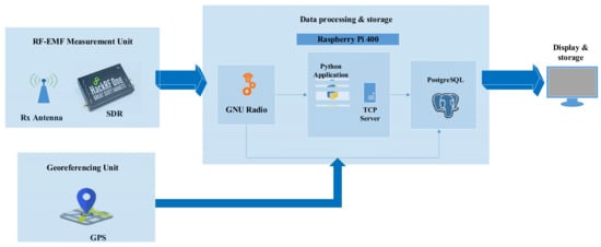This section describes the steps undertaken in the design of the EMF exposure measurement system, represented by a block diagram depicted in Figure 1. As noted, the RF-EMF measurement unit consists in a low-cost SDR HackRF and an omnidirectional receiving antenna. The system’s core unit is represented by a Raspberry Pi 400 platform, which is basically a programmable computer based on the Advanced RISC Machine (ARM) architecture and runs on the Linux-based Raspberry Pi operating system (OS) also known as Raspbian. The Raspberry Pi 400 is designed in the form of a compact keyboard, with the computer components integrated into the keyboard itself.