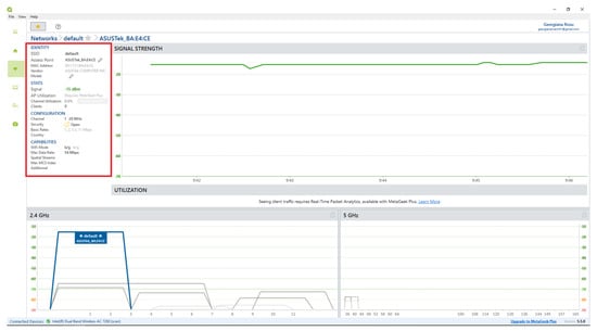 Given that this measurement pertains to a fixed channel configuration, supplementary data concerning the highest available Wi-Fi channel are supplied through the utilization of inSSIDer software 3.1.2.1, an open-source application. Figure 2 illustrates the standard dataset provided by inSSIDer, encompassing details such as the names of all accessible Wi-Fi networks, their respective Wi-Fi channel allocations, and the Received Signal Strength Indicator (RSSI). In this specific instance, one of the networks, labeled as “default”, employs the IEEE 802.11 b/g protocol and operates on Wi-Fi Channel 1, exhibiting a signal strength of −15 dBm. Within the scope of our system, the critical information furnished by inSSIDer pertains exclusively to the Wi-Fi channel. Each channel within the 2.4 GHz network operates within a bandwidth of 20 MHz, which corresponds to the maximum bandwidth that the HackRF receiver can accommodate. Having this information at hand, we can select the appropriate central frequency for the receiver.
